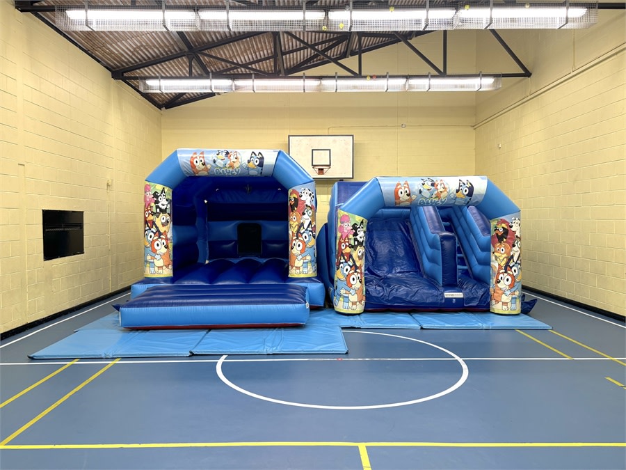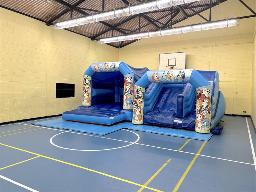 The Blu-ey Bouncy Castle & matching slide is an ideal size for indoor village hall parties. Our inflatables can also be hired for outdoor parties during the warmer months. The castle features a shower cover for shade and rain protection. 🎉